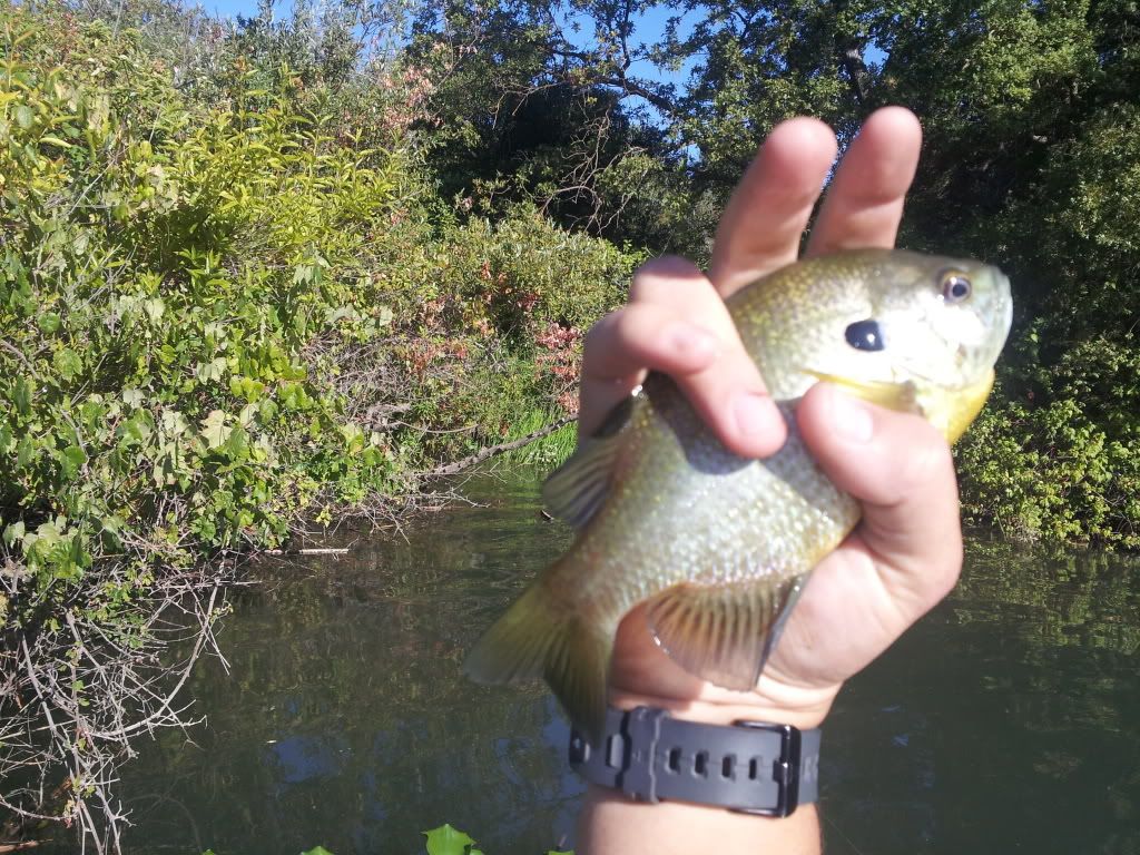I tried working some boat docks and I finally found a school in a cove next to a dock. Nothing but a small piece of a powerworm on a mosquito hook is all you need to go to town on these guys.