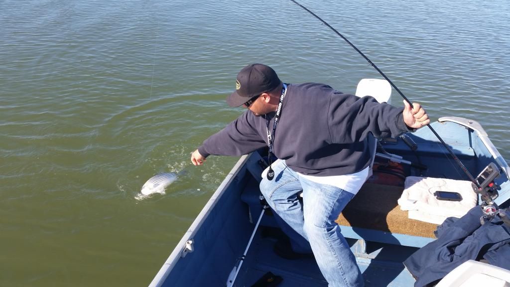 Nothing else working here though so up the river we went looking for the striper schools. Found a rock wall holding fish and Rick was able to get the first keeper size fish in the boat.